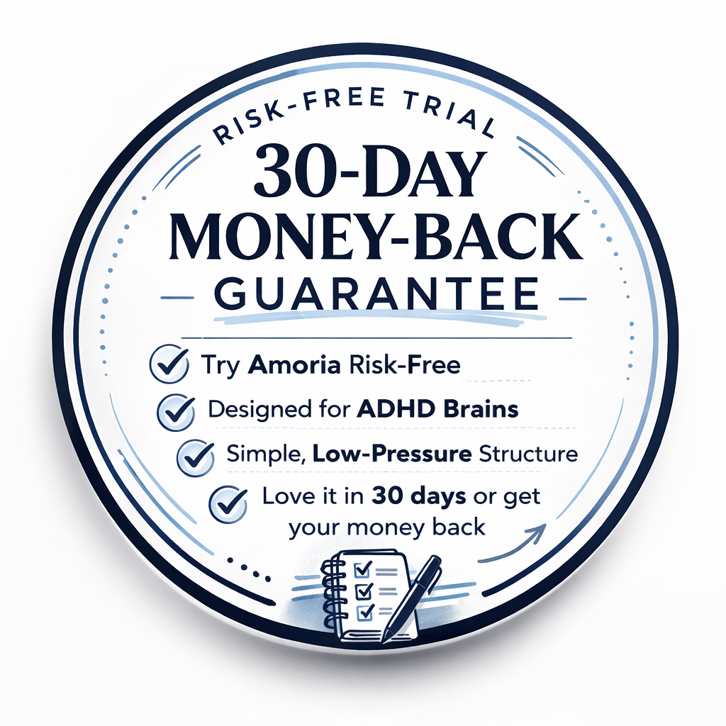 Amoria™ is designed around real-life ADHD friction—starting, switching tasks, and finishing. Each page uses simple structure and gentle guidance to help you move forward without overthinking or feeling behind.